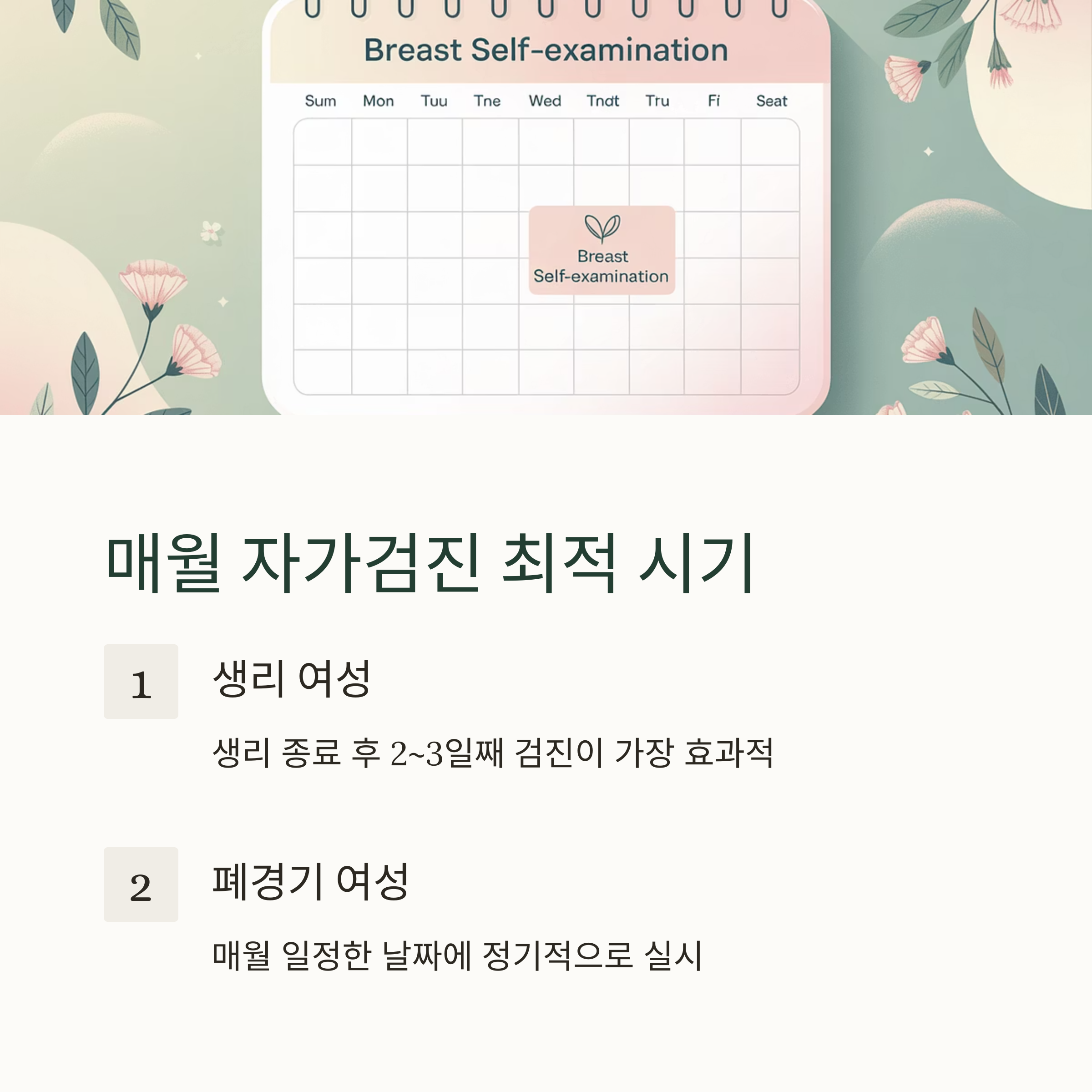 자가검진은 생리 주기에 따라 유방 조직이 변화하는 특성을 고려해야 합니다.
