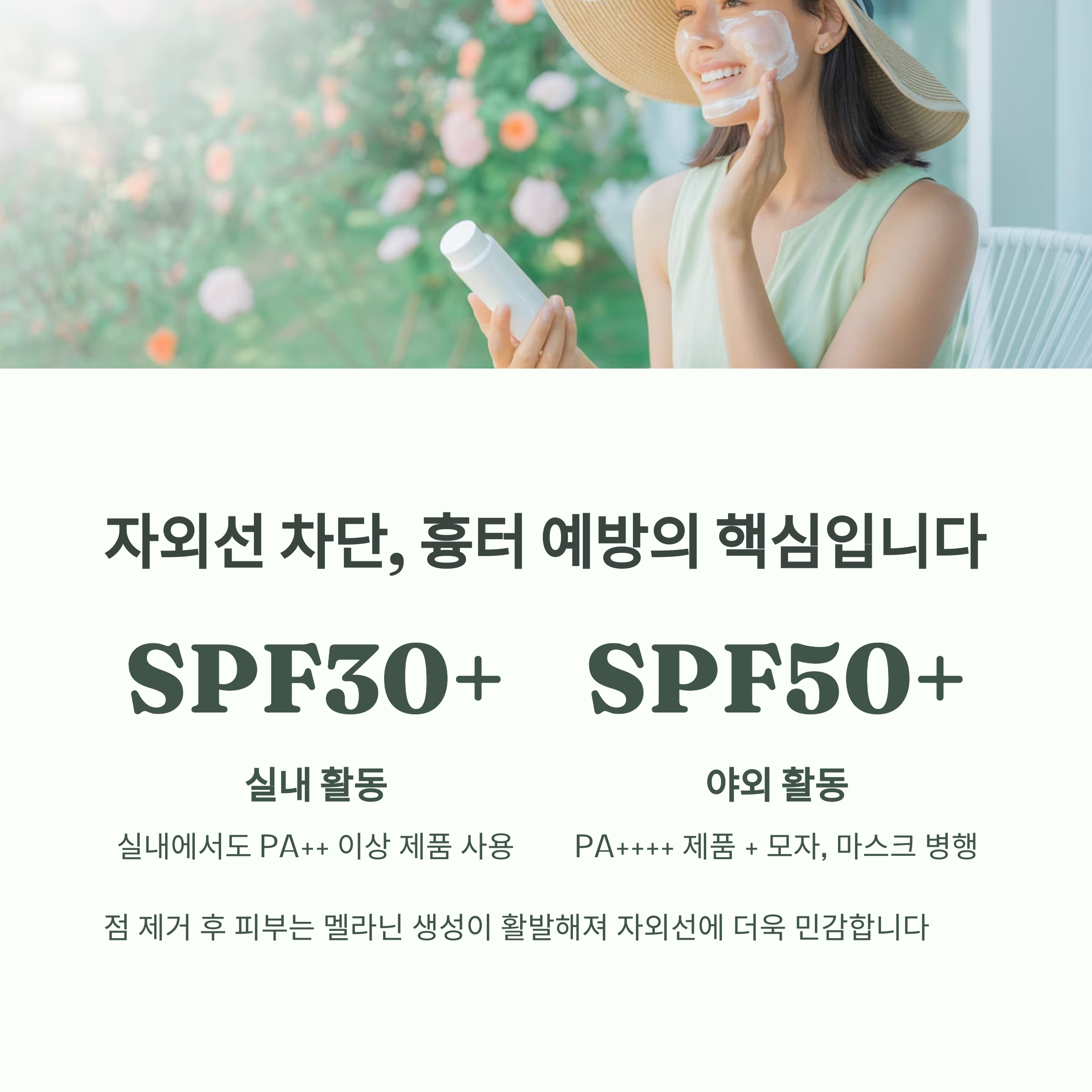 | 야외 활동 시 | SPF50+ PA++++ 제품 필수 + 모자, 선글라스 |