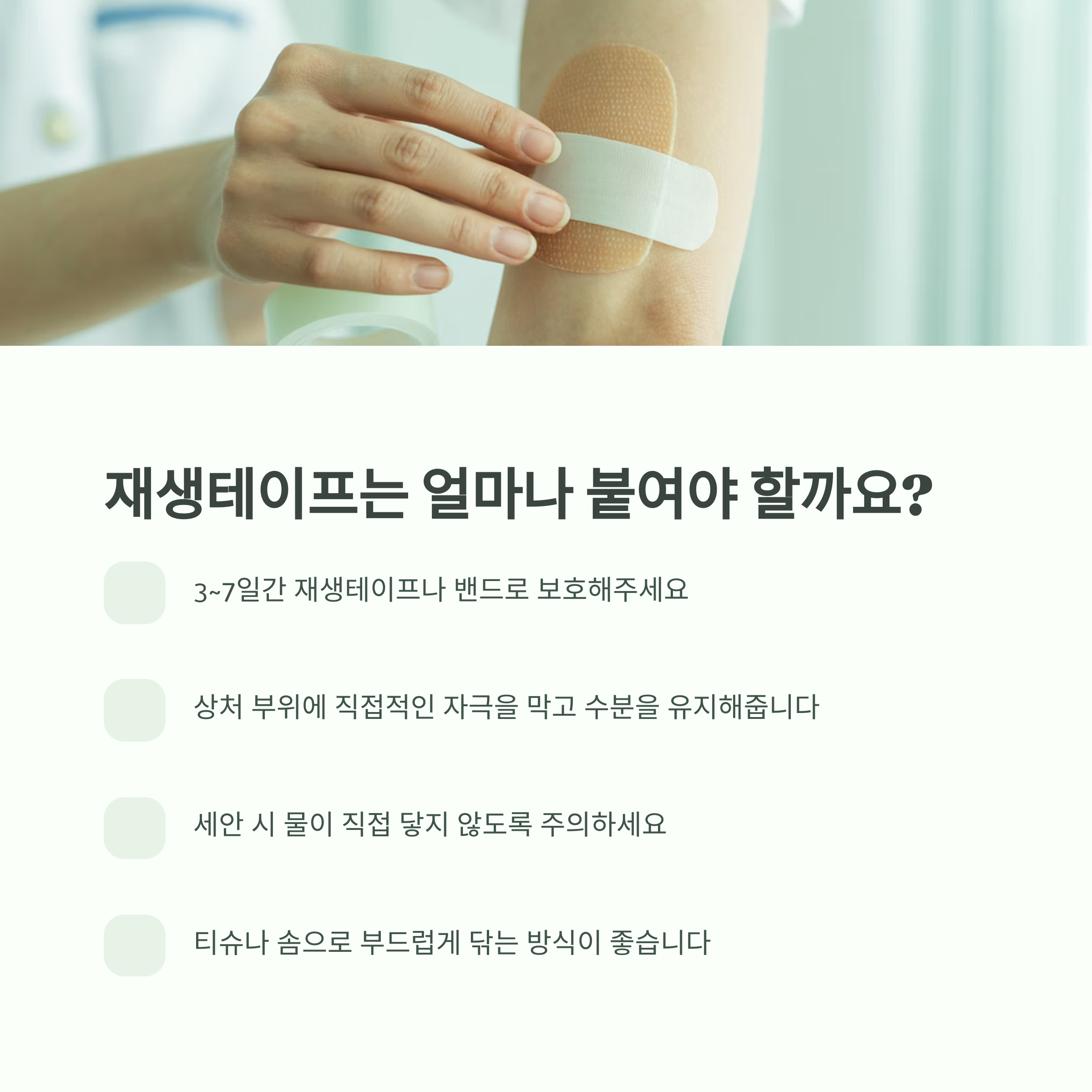 병원에서 붙여준 재생 밴드를 그대로 유지하는 것이 중요합니다.