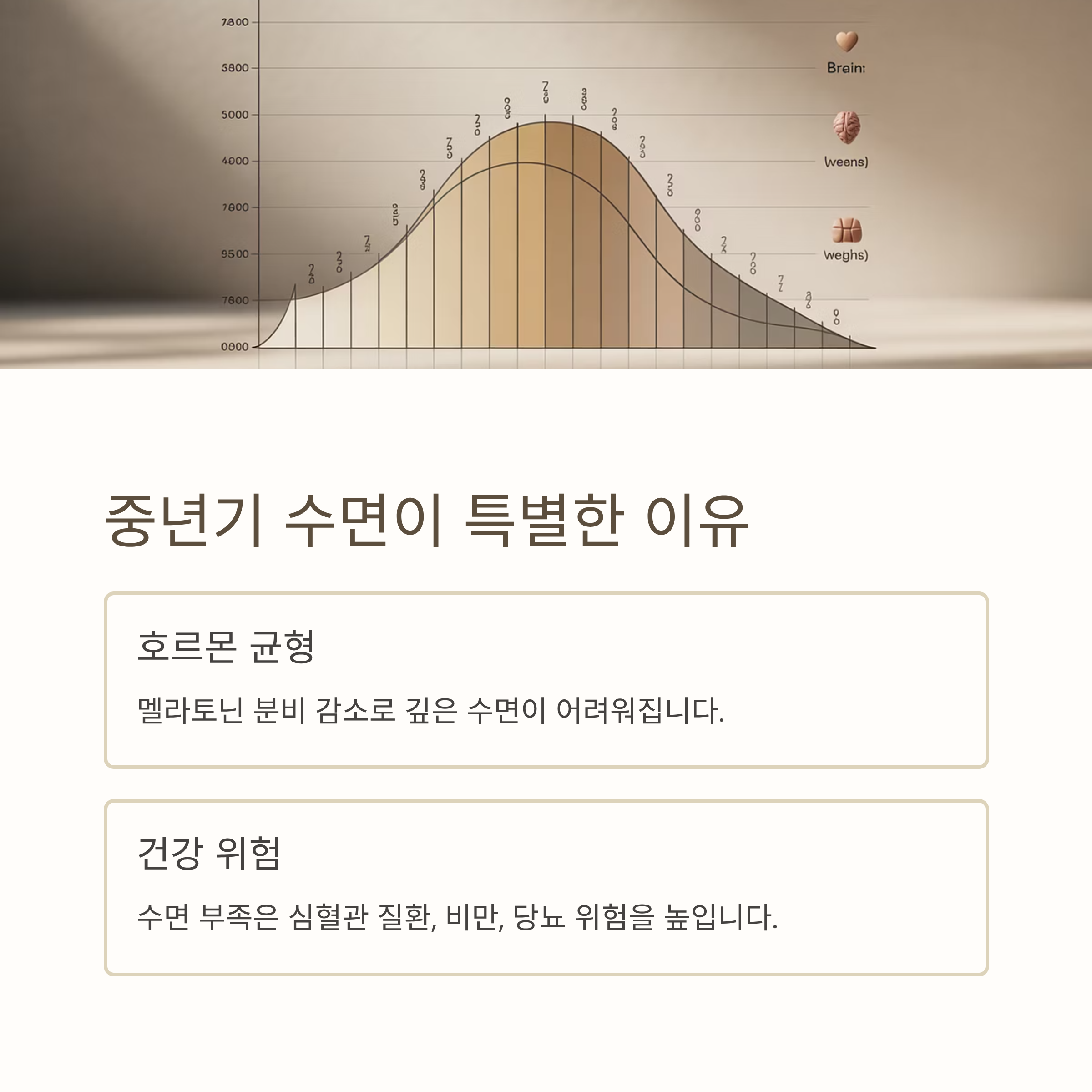 중년이 되면 멜라토닌 분비가 감소하여 깊은 수면에 어려움을 겪는 경우가 많습니다.