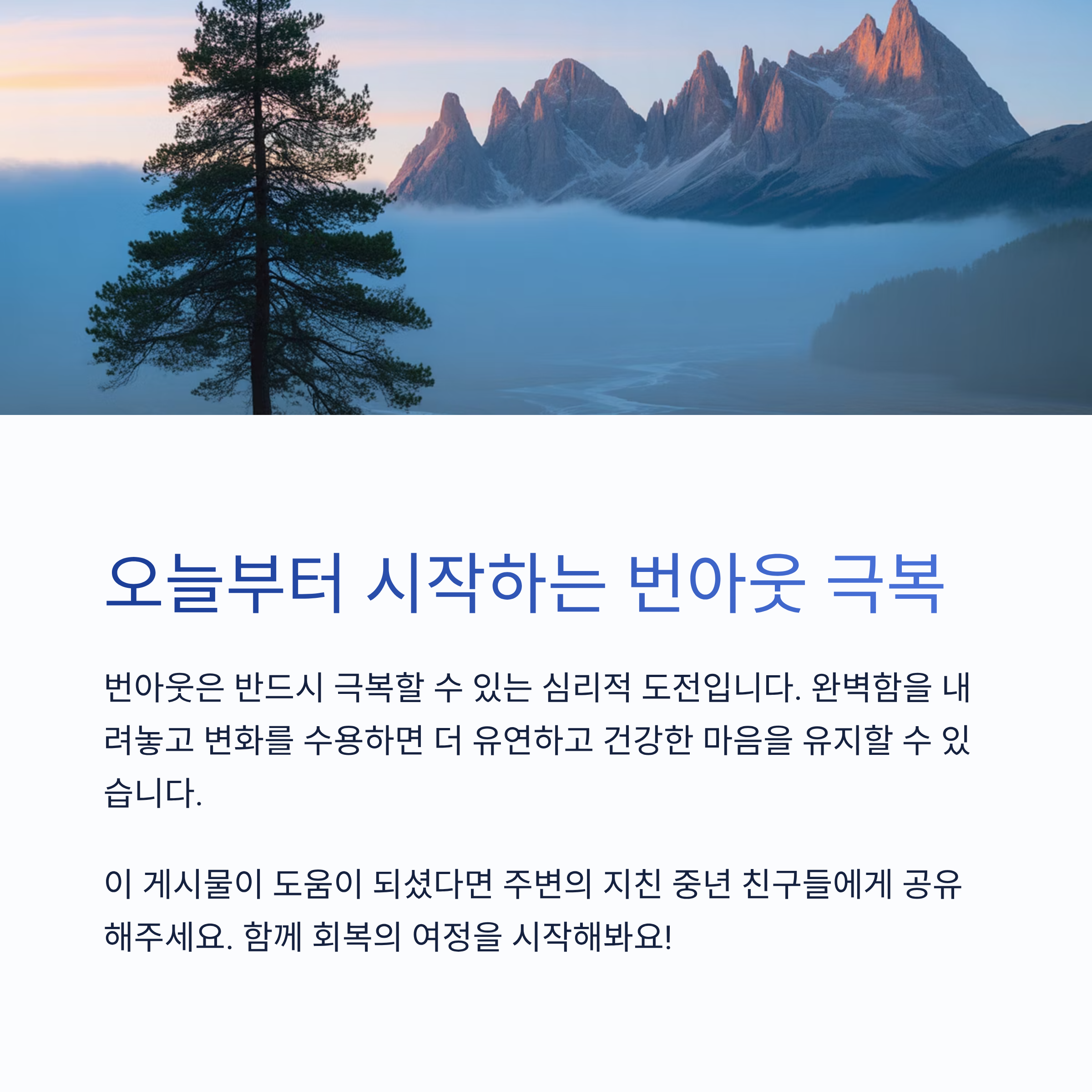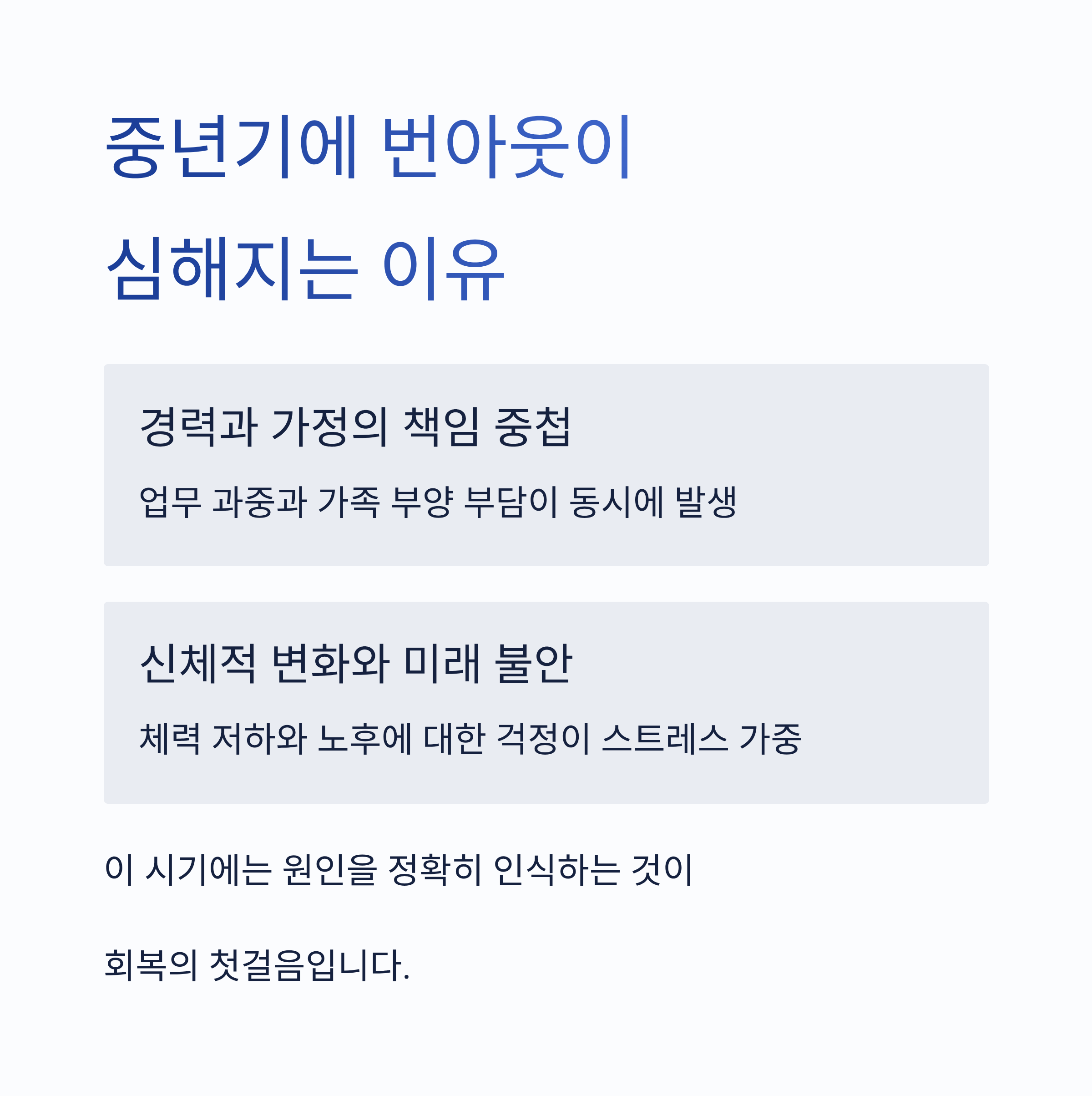 회복과 성장을 동시에 이끌어낼 수 있습니다. 오늘은 중년 번아웃의 정의, 원인, 그리고