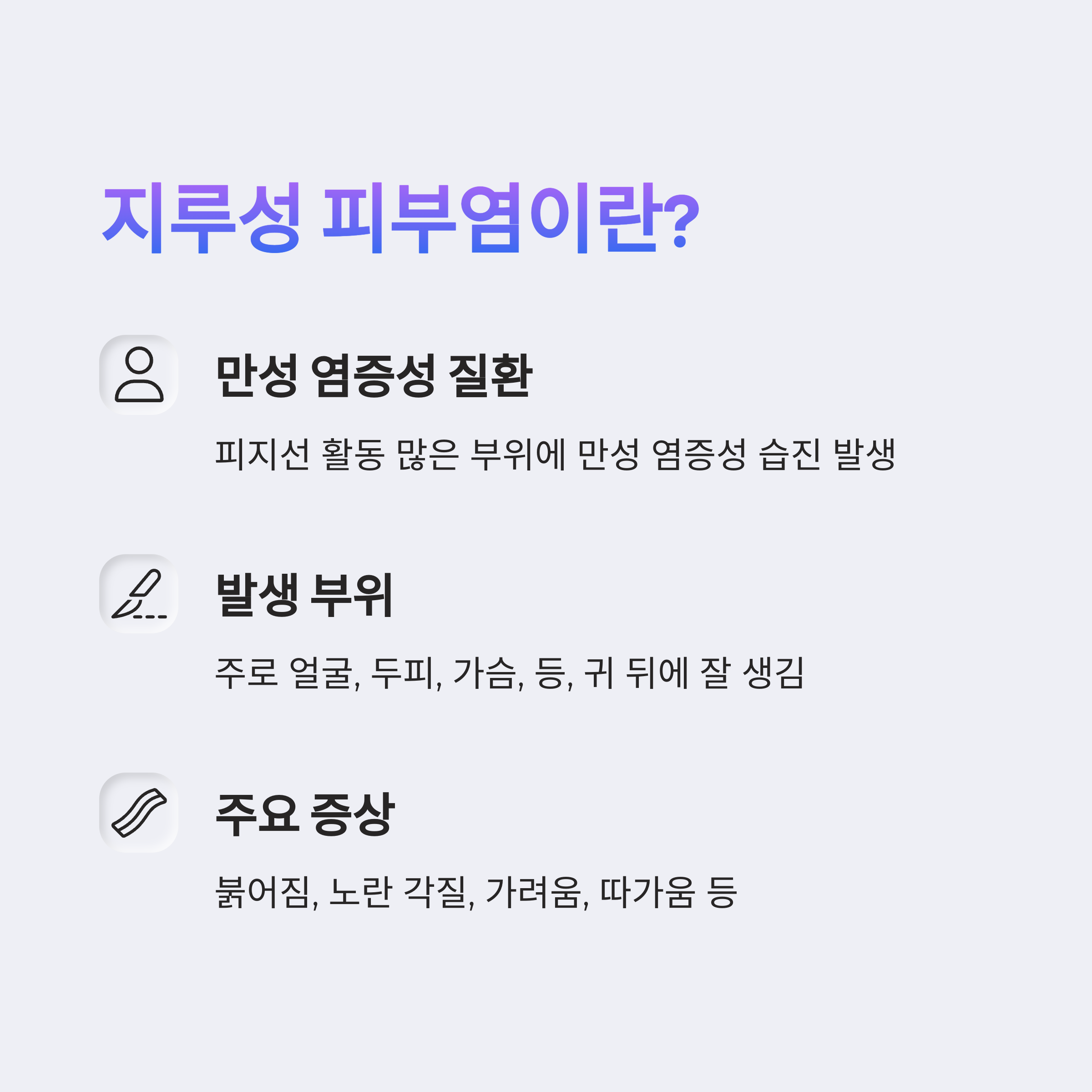 지루성 피부염은 주로 피지 분비가 활발한 부위에 발생하는 만성 염증성 질환입니다.