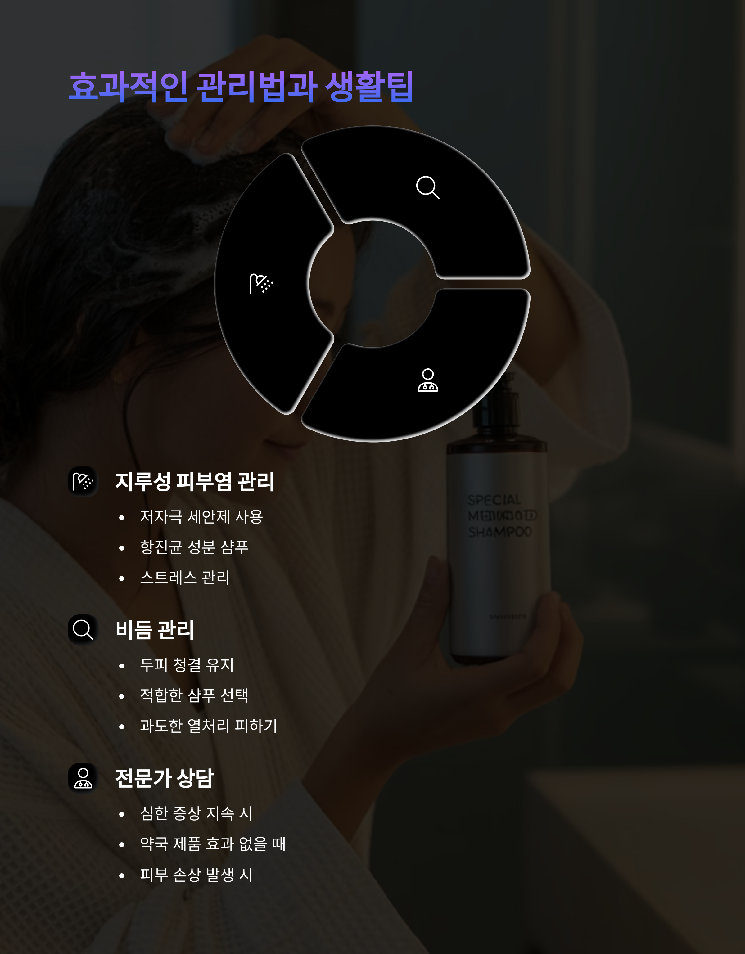 | 비듬 | 지성용 샴푸, 항진균 성분 사용, 두피 마사지 | 건조한 환경, 잦은 염색 피하기 |