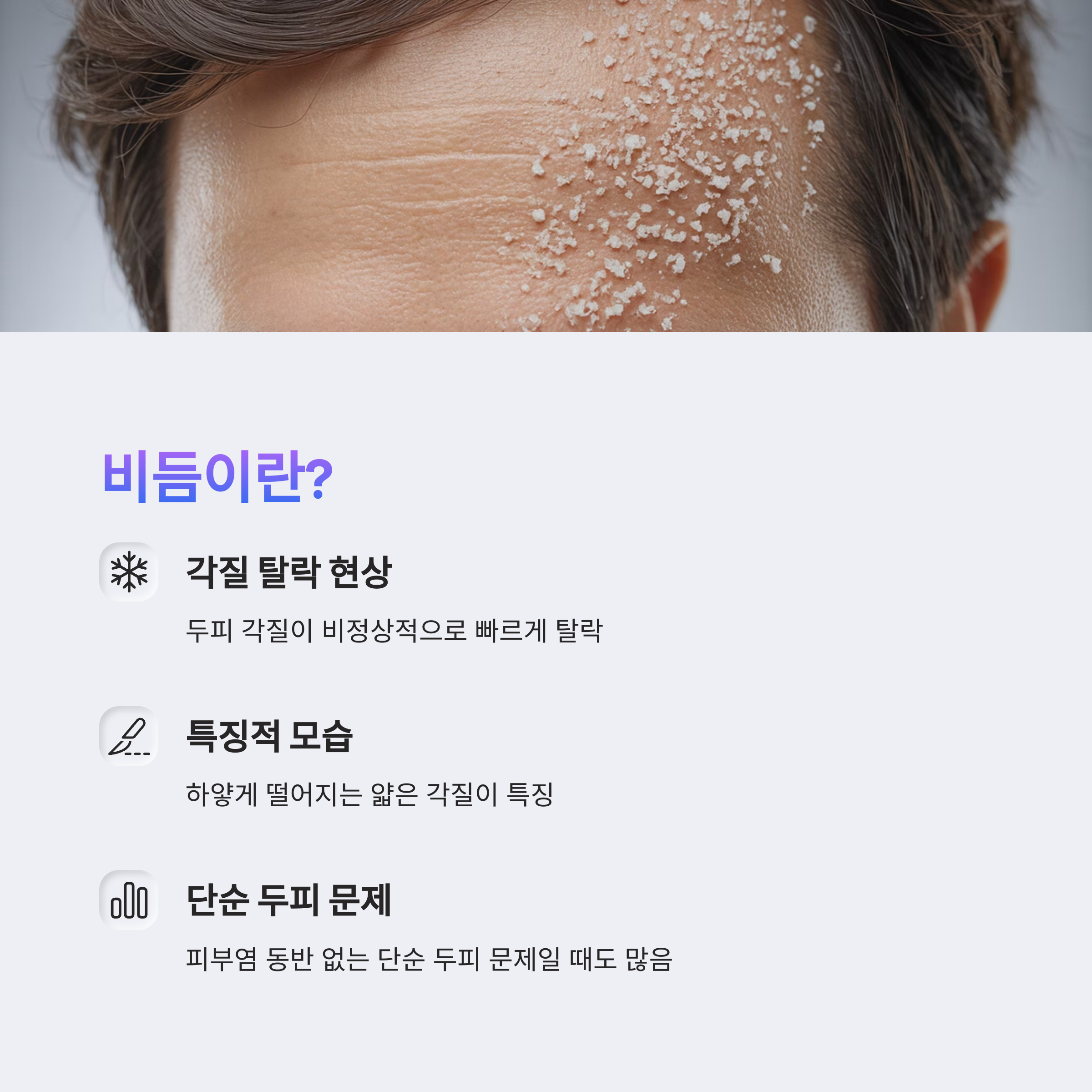비듬은 두피에서 하얗고 건조한 각질이 떨어지는 두피 질환의 일종입니다.