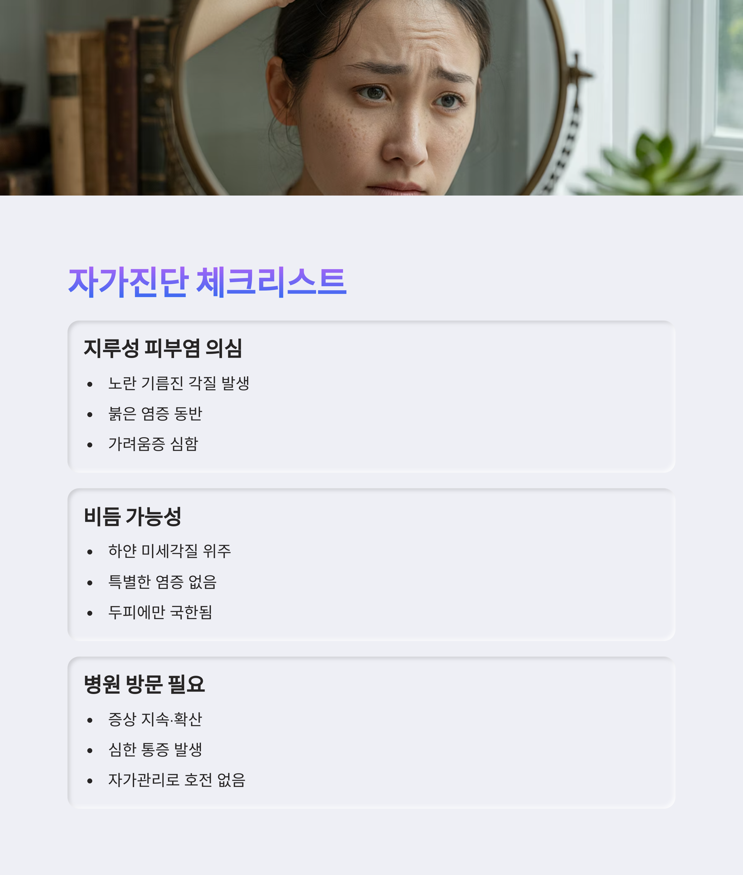 과도한 세정이나 강한 성분의 화장품은 증상을 악화시킬 수 있습니다.