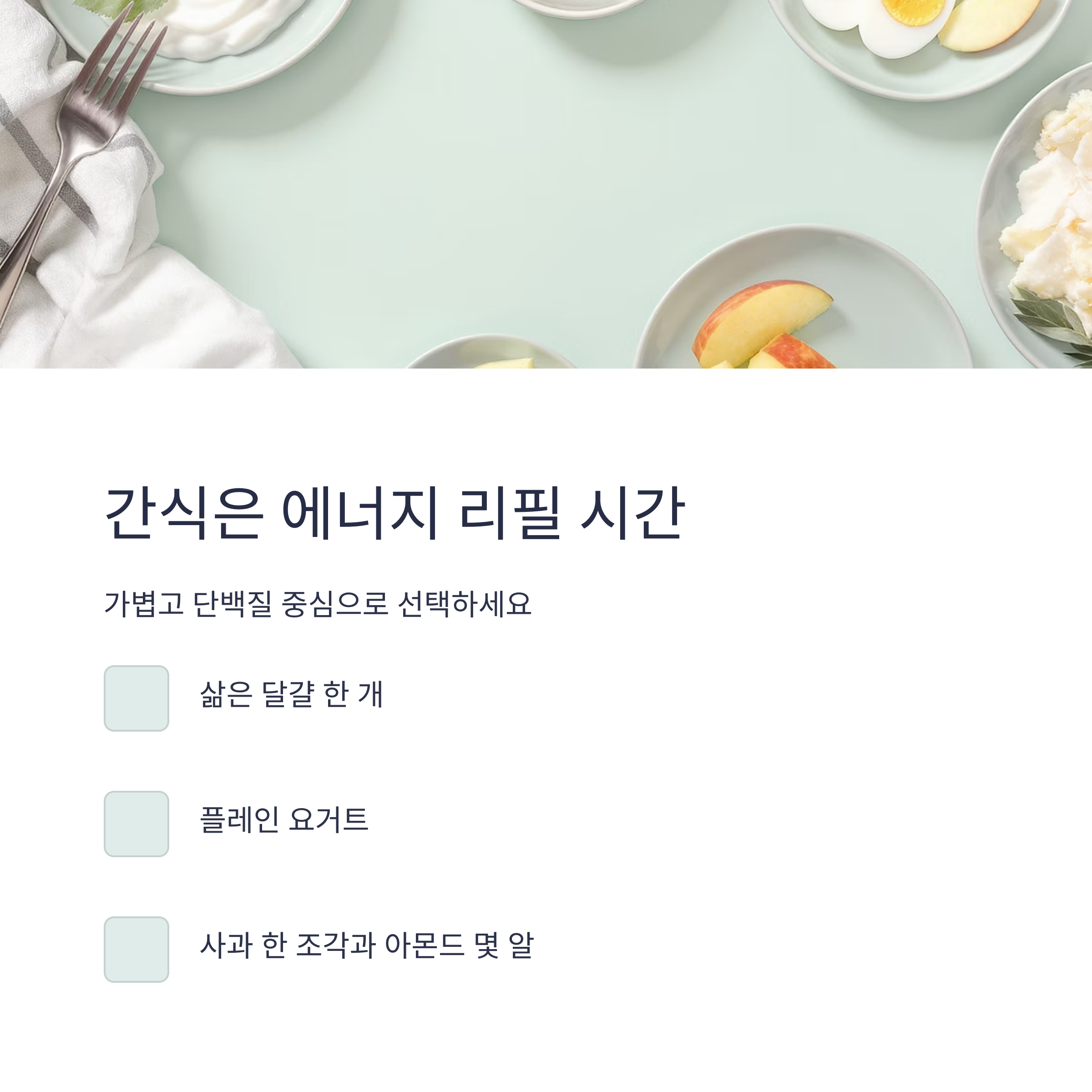 활력을 위한 간식은 ‘가볍고, 단백질 중심’으로 선택해야 합니다.