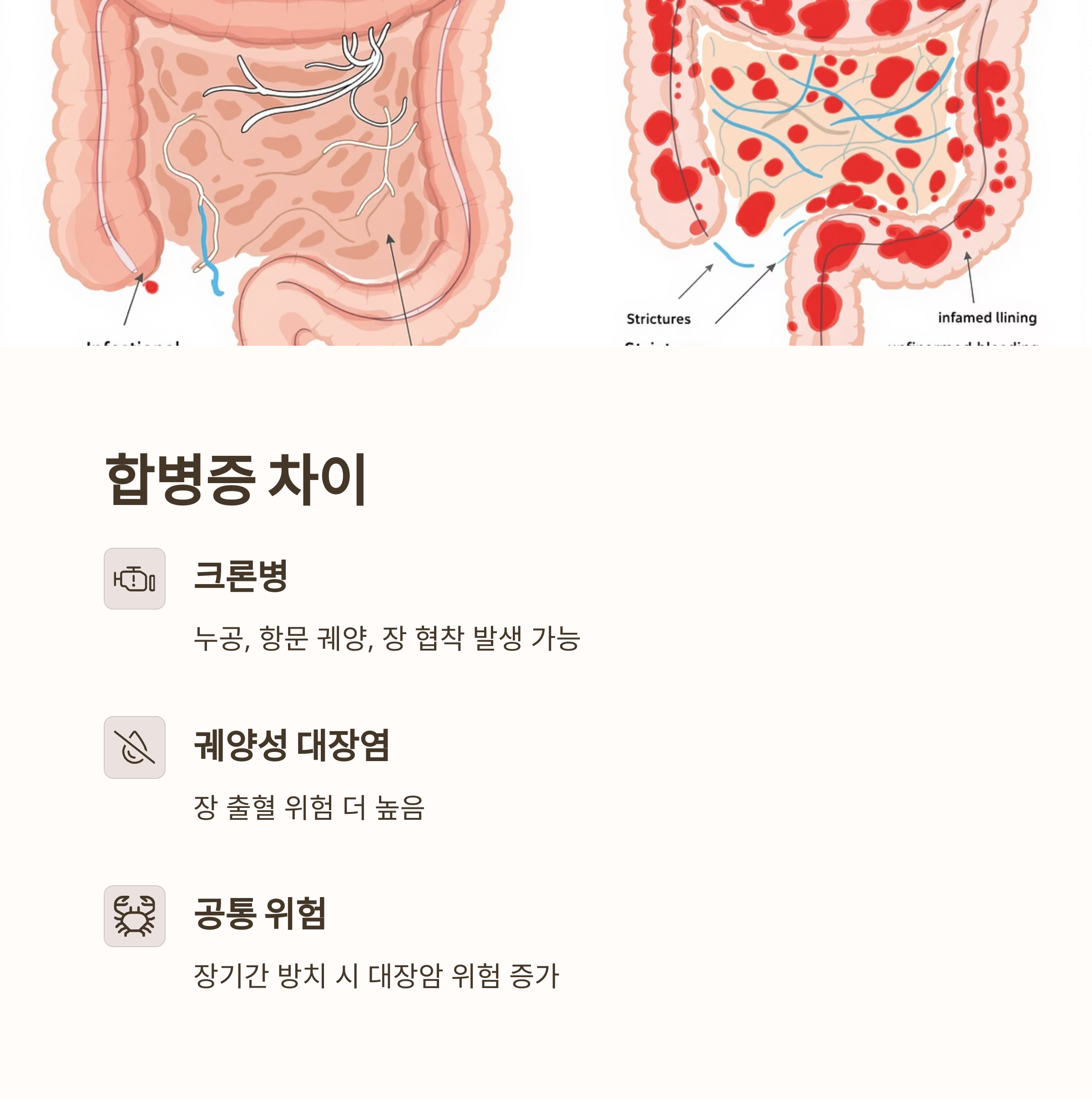 | 주 증상 | 지속 복통, 항문 병변 | 간헐 복통, 직장 출혈 |