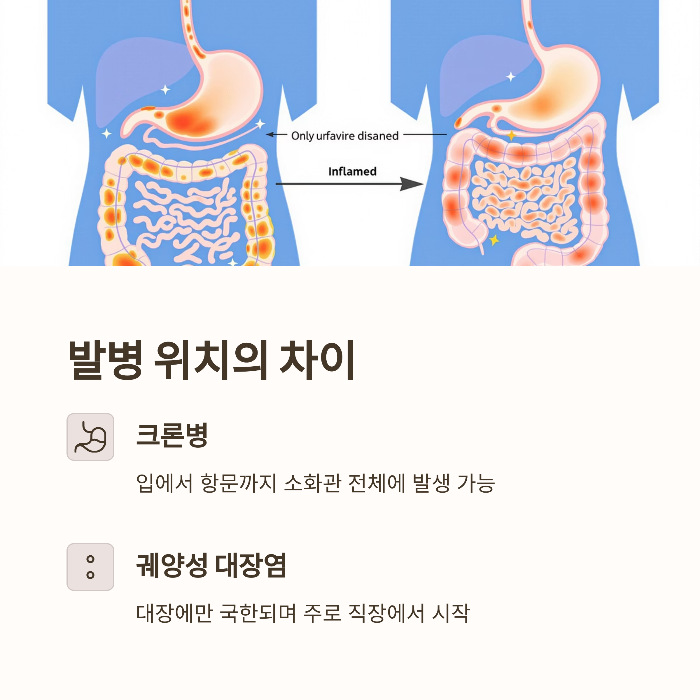 핵심: 크론병은 전 소화관, 궤양성 대장염은 대장에만 영향을 미칩니다.