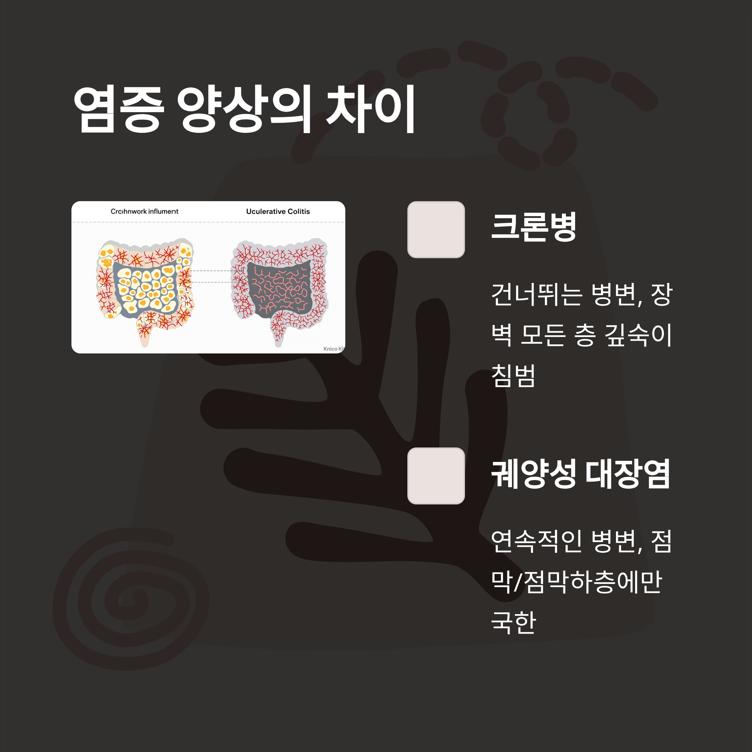 염증 부위와 병변 양상에서 뚜렷한 차이를 보입니다.