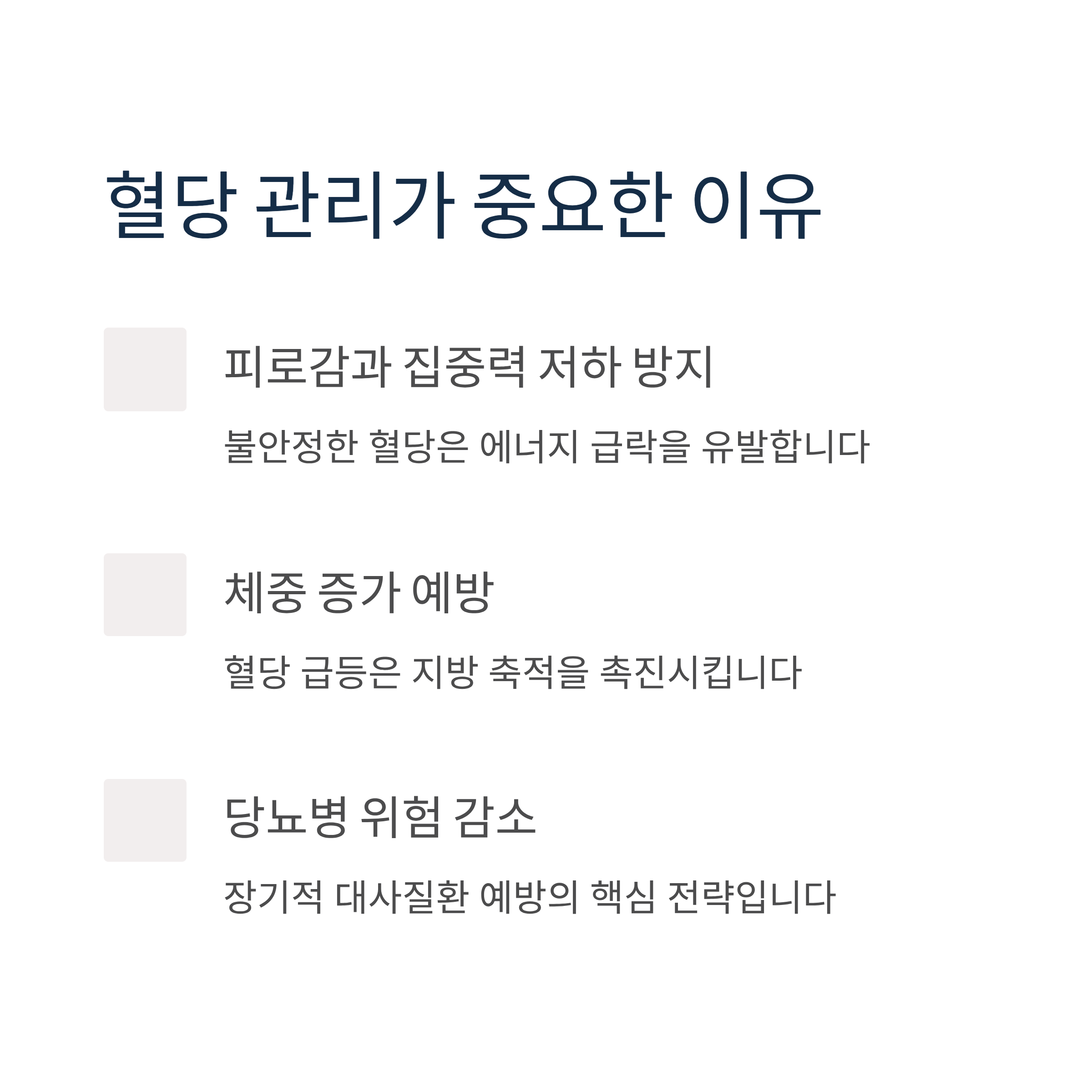 혈당이 불안정하면 피로감, 집중력 저하, 체중 증가로 이어질 수 있습니다.