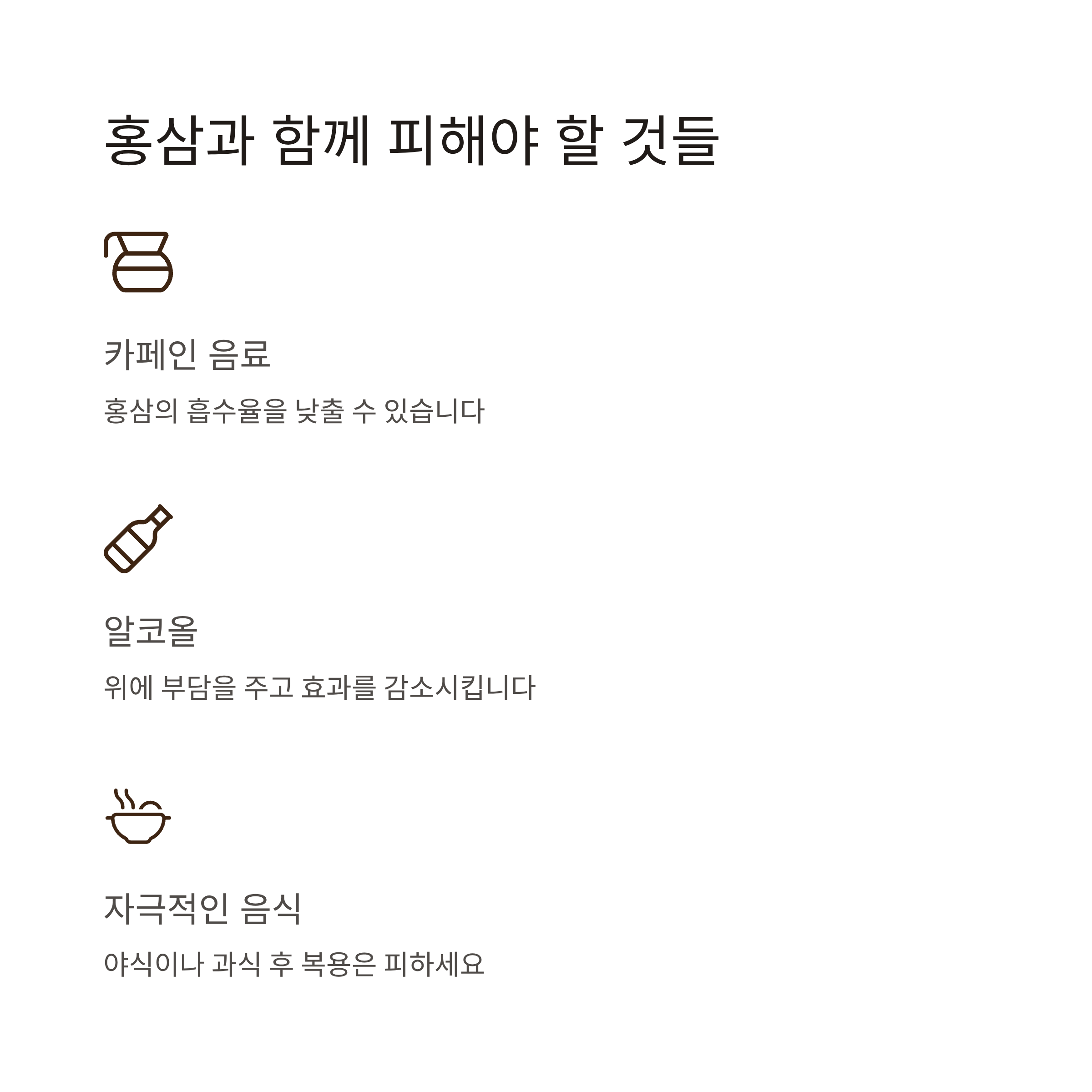 카페인 음료, 알코올, 자극적인 음식은 홍삼과 함께