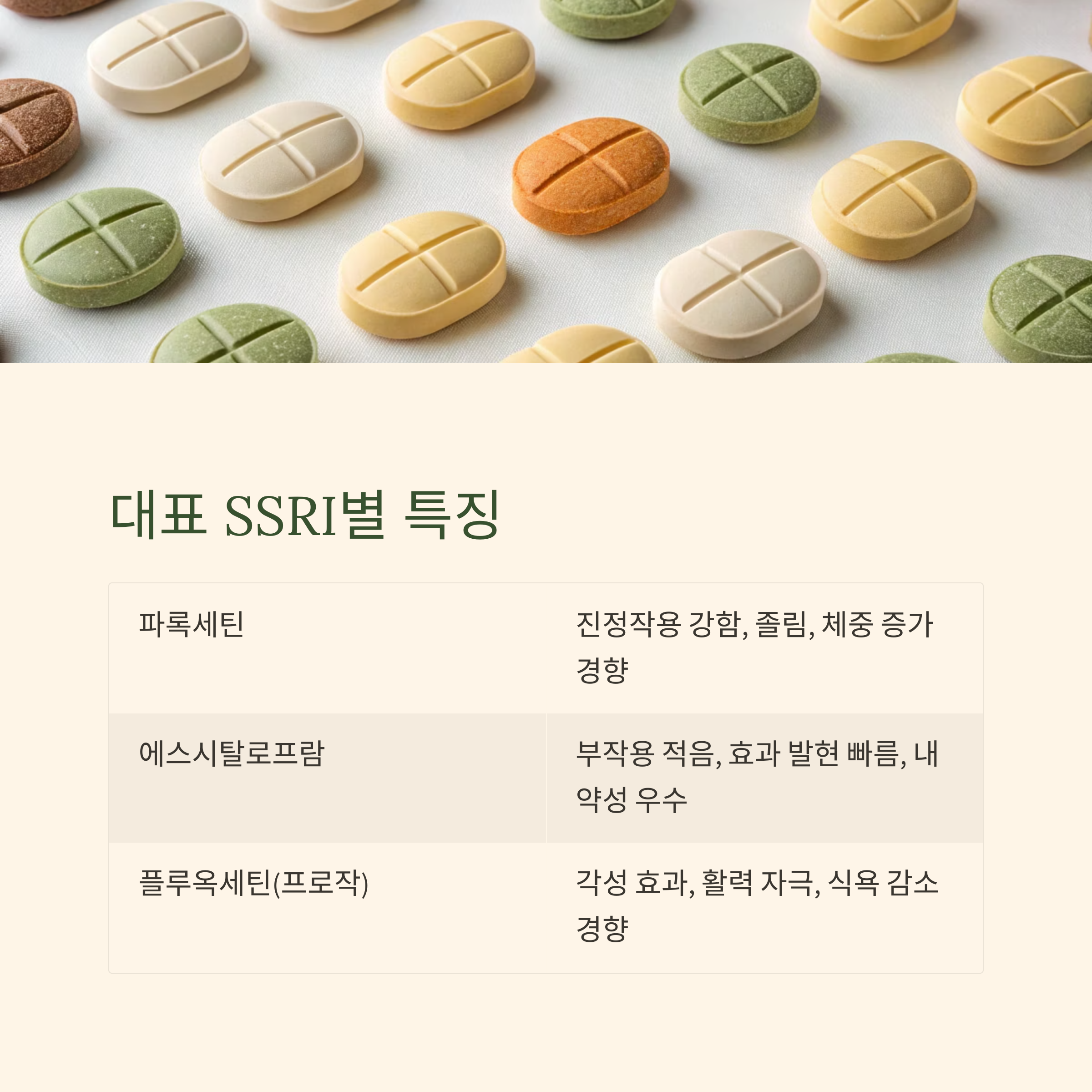 우울증 치료에 널리 사용되는 선택적 세로토닌 재흡수 억제제(SSRI)는 효과적이지만, 복용 초기에는 다양한 부작용과 주의할 점이 있습니다. 이 글에서는 SSRI의 특징, 대표 약물별 차이, 부작용, 청소년에서의 주의사항, 그리고 효과적인 치료를 위한 관리법을 객관적으로 정리합니다.